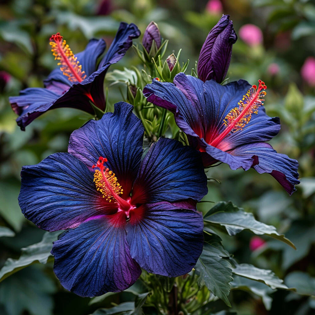 - Тёмно-синий цвет: главная особенность этого сорта — его уникальный, редкий и завораживающий цвет. Цветки гибискуса «Саншайн Кисс» имеют насыщенный тёмно-синий цвет, что делает его одним из самых необычных и желанных сортов.
