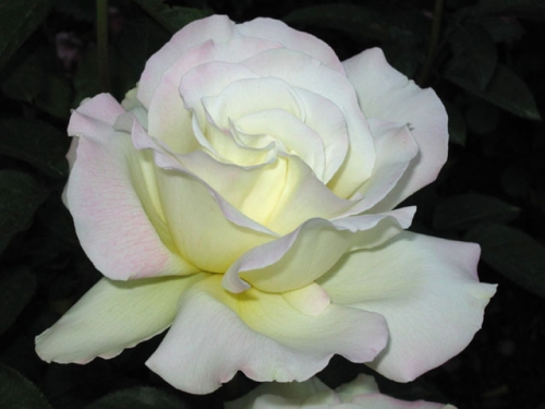Кустарник вырастает крепким и прямостоячим, высотой 1,5 м и диаметром около 1 м. По всей длине побеги покрыты крупной, ярко-зеленой листвой. На макушках стеблей формируются аккуратные бутоны. Распускаясь, они образуют крупные (шириной 13 см), густомахровые цветки. Лепестки у розы бело-кремового оттенка. Бутоны распускаются по одному, поэтому растение долгое время сохраняет декоративный вид. Период цветения длится до глубокой осени, пока не начнутся заморозки. Тенека источает приятный аромат.